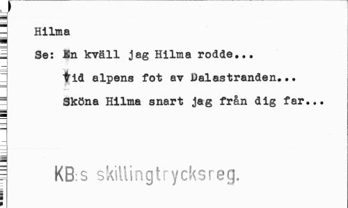 //// ¦ Hilma //// i Se: In kväll jag Hilma rodde... //// tid alpens fot av Dalastranden... Sköna Hilma snart jag från dig far... //// 1 KB:s skillingtrycksreg. //// i //// i ////