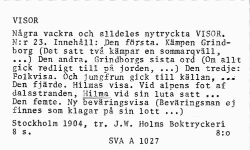 //// VISOR //// Några vackra och alldeles nytryckta VISOR. N:r 23, Innehåll:^Den första. Kämpen Grindborg (Det satt två kämpar en sommarqväll, ...) Den andra. Grindborgs sista ord (Om allt gick redligt till på jorden, ...) Den tredje: Folkvisa. Och jungfrun gick till källan, ... Den fjärde. Hilmas visa. Vid alpens fot af dalastranden, Hilma vid sin luta satt ... Den femte. Ny beväringsvisa (Beväringsman ej finnes som klagar på sin lott ...) //// Stockholm 1904, tr. J.W. Holms Boktryckeri 8 s. 8: o //// SVA A 10 2 7 ////