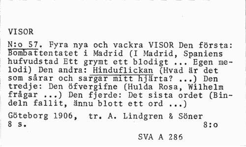 //// VISOR //// N:o 57. Fyra nya och vackra VISOR Den första: Bombattentatet i Madrid (I Madrid, Spaniens hufvudstad Ett grymt ett blodigt ... Egen melodi) Den andra: Hinduflickan (Hvad är det som sårar och sargar mitt hjärta? ...) Den tredje: Den öfvergifne (Hulda Rosa, Wilhelm frågar ...) Den fjerde: Det sista ordet (Bindeln fallit, ännu blott ett ord ...) //// Göteborg 1906, tr. A. Lindgren & Söner 8 s. 8:o //// SVA A 286 ////