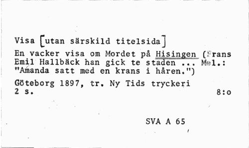 //// - //// Visa £utan särskild titelsida] //// En vacker visa om Mordet på Hisingen (Frans Emil Hallbäck han gick te staden ... Mel,: "Amanda satt med en krans i håren.") //// Göteborg 1897, tr. Ny Tids tryckeri 2 s. 8:0 //// SVA A 65 //// / ////