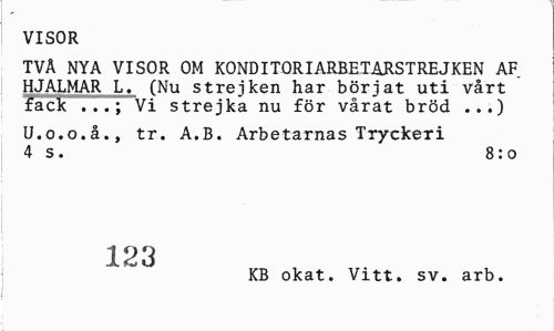 //// VISOR //// TVÅ NYA VISOR OM KONDITORIARBETARSTREJKEN AF HJALMAR L. (Nu strejken har börjat uti vårt fack 777; Vi strejka nu för vårat bröd ...) //// U.o.o.å., tr. A.B. Arbetarnas Tryckeri 4 s. 8:0 //// 123 //// KB okat. Vitt. sv. arb. ////
