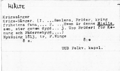 //// ta Klte //// I k r i^r s s-s.r*frcx* //// 'Krigs-Sånger. (T. ...Samlen3, Bröder, kring i friheters fana,... 2. .. .Hvrem är denne H,j,<?Ue f som, stor gensm dygd... 3. Upp Broderi for Konung och Fädernebygd,...) Nyköping lfil3, tr, P.Winge //// 8 s. 8:o //// UUB Folkv. kapal. ' ////