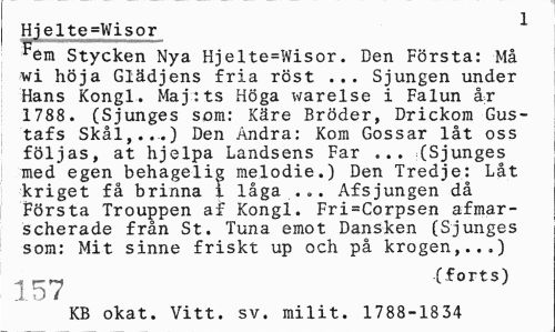 //// Hielte=Wisor //// MBHWMHMHMHMMMMMi //// Fem Stycken Nya Hjelte=Wisor. Den Första: Må wi höja Glädjens fria röst ... Sjungen under Hans Kongl. Maj:ts Höga warelse i Falun år 1788. (Sjunges som: Käre Bröder, Drickom Gustafs Skål,...) Den Andra: Kom Gossar låt oss följas, at hjelpa Landsens Far ... (Sjunges med egen behagelig melodie.) Den Tredje: Låt kriget få brinna i låga,... Afsjungen då Första Trouppen af Kongl. Fri=Corpsen afmarscherade från St. Tuna emot Dansken (Sjunges som: Mit sinne friskt up och på krogen,...) //// (forts) //// .1 o 7 //// KB okat. Vitt. sv. milit. 1788-1834 ////