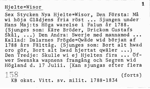 //// 1 //// Hjelte=Wisor //// Sex Stycken Nya Hjelte=Wisor, Den Första: Må wi höja Glädjens fria röst .». Sjungen under Hans Maj:ts Höga warelse i Falun år 1788. (Sjunges som: Käre Bröder, Drickom Gustafs Skål, ...) Den Andra: Swerje med mannamod ... Kallad: Dalarnes Frögde=Qwäde wid början af 1788 års Fälttåg. (Sjunges som: Bort alt hwad oro gör, Bort alt hwad hjertat qwäler ...) Den Tredje: Skulle wi ej Hjelten fira ... öfwer Swenska wapnens framgång och Segren wid Högland d. 17 Julii. (Kan sjungas efter flera //// 158 (forts) //// KB okat. Vitt. sv. milit. 1788-1834 ////