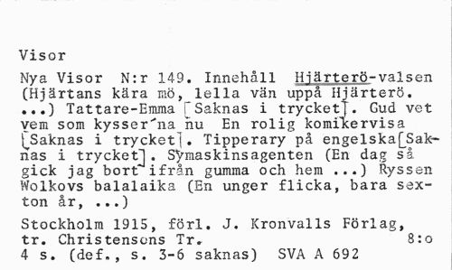 //// Visor //// Nya Visor N:r 149. Innehåll Hjärterö-valsen (Hjärtans kära mö, lella vän uppå Hjärterö. ...) Tattare-Emma fSaknas i tryckett. Gud vet vem som kysser^na hu En rolig komikervisa [Saknas i trycket]. Tipperary på engelska[Sak-nas i trycket]. Symaskins agenten (En dag så gick jag bort ifrån gumma och hem ...) Ryssen Wolkovs balalaika (En unger flicka, bara sexton år, ...) //// Stockholm 1915, förl. J. Kronvalls Förlag, tr. Christensons Tr. 8:0 //// 4 s. (def„, s. 3-6 saknas) SVA A 692 ////