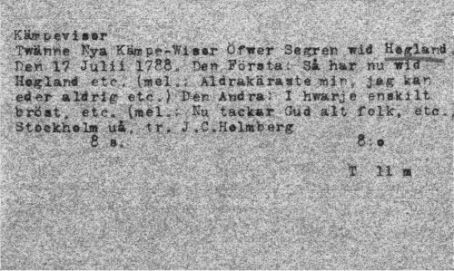 //// Kän> peviser //// Twänrte tfya Kämpe-Wisor Öfwer Se gren wid Heglar.d Den 17 Juli i 1788. Den Första; Si har nvTvTtF* Haglani etc ;;(stel *i Aldrakäraste min , j.ag kan e4er aldrig etc .) • pén Åwdra; I hwarj e enskilt bröst, etc. (mel„; Ku tackar Gud alt folk» etc» Stockholm uå, tr. J »C.Holmberg //// 8 s. 8; o //// iV .i ' . - \ V. " - * x 11 m , ¦ ' //// IllÉlti^i^ ////