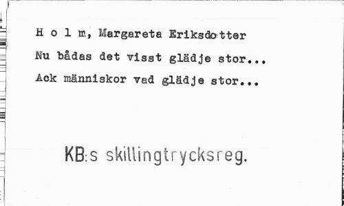 //// I //// ; Holm, Margareta Eriksdotter 5 Nu "bådas det visst glädje stor... Aek människor vad glädje stor... //// : KB:S skitti n g tr y eks reg. ////