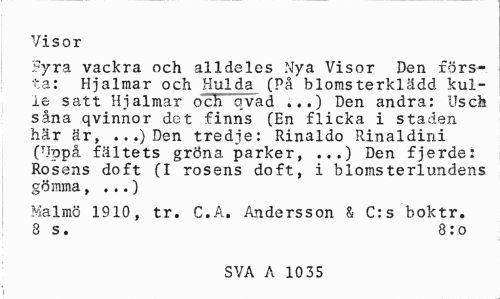 //// Visor //// Fyra vackra och alldeles Nya Visor Den rörs-ta: Hjalmar och Hulda (På blomsterklädd kulle satt Hjalmar och övad ,..) Den andra: Usch såna qvinnor det finns (En flicka i staden här är, ...) Den tredje: Rinaldo Rinaldini (Uppå fältets gröna parker, ...) Den fjerde: Rosens doft (I rosens doft, i blomsterlundens gömma, ...) //// Malmö 1910, tr. C.A. Andersson & C:s boktr. 8 s. 8:0 //// SVA A 10 35 ////