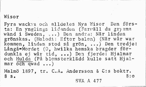 //// Wisor //// Fyra wackva och. alldeles Nya Wisor Den första: En ynglings lidanden (Farväll du gry Ma v/änd i Sweden, „..) Den andra: När linden grönskas. (Melodi: Efter balen) (När wår war kommen, linden stod så grön, ...) Den tredje: Långå-Mordet (0, hwilka hemska bragder fördunkla ej wår cid, ...) Den fjerde: Hjalmar och Hulda (På blomsterklädd kulle satt Hjalmar och qwad ...) //// Malmö 1897, tr. C. A. Andersson & C:s boktr. 8 s. 8:o //// SVA A 477 ////