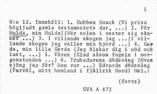 //// 1 //// N:o 12, Innehåll; 1. Gubben Noack (Vi prisa högljudt gamla testamentets dar, ...) 2, För Hulda, min Hulda!(När solen i vester sig sänker ...) 3. I villande skogen jag ,.. (I villande skogen jag vallar min hjord ...) 4. Ger da, min lilla Gerda (Jag älskar dig i nöd och lust, ...) 5. Våren (Glad såsom fogeln i morgonstunden ...) 6. Trubadurens dödssång (Hvem sjöng jag för? Hon var ...) Edvards dödssång (Farväl, mitt hemland i fjällrik Nord! Mel.: //// (forts) //// SVA A 4 72 ////