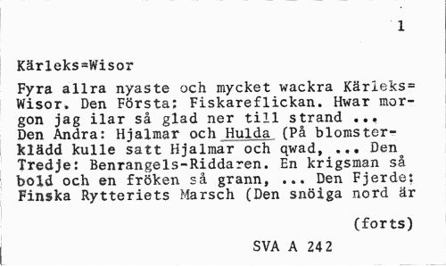 //// 1 //// Kärleksvisor //// Fyra allra nyaste och mycket wackra Kärleks= Wisor. Den Första; Fiskareflickan. Hwar morgon jag ilar så glad ner till strand ... Den Andra: Hjalmar och Hulda (På blomsterklädd kulle satt Hjalmar och qwad, ... Den Tredje: Benrangels-Riddaren. En krigsman så bold och en fröken så grann, ... Den Fjerde: Finska Rytteriets Marsch (Den snöiga nord är //// (forts) //// SVA A 24 2 ////