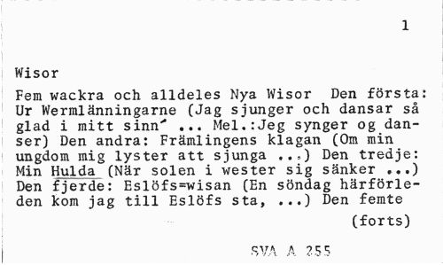//// 1 //// Wisor //// Fem wackra och alldeles Nya Wisor Den första: Ur Wermlänningarne (Jag sjunger och dansar så glad i mitt sinn"* ... Mel.:Jeg synger og danser) Den andra: Främlingens klagan (Om min ungdom mig lyster att sjunga ..„) Den tredje: Min Hulda (När solen i wester sig sänker ...) Den fjerde: Eslöfs=wisan (En söndag härförleden kom jag till Eslöfs sta, ...) Den femte //// (forts) //// ¦SVA A 255 ////