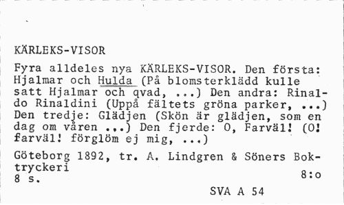 //// KÄRLEKS-VISOR //// Fyra alldeles nya KÄRLEKS-VISOR. Den första: Hjalmar och Hulda. (På blomsterklädd kulle satt Hjalmar och qvad, .,.) Den andra: Rinal-do Rinaldini (Uppå fältets gröna parker, ...) Den tredje: Glädjen (Skön är glädjen, som en dag om våren .,.) Den fjerde: 0, Farväl! (0! farväl.' förglöm ej mig, ..,) //// Göteborg 1892, tr. A. Lindgren & Söners Boktryckeri R 8 s. 8,0 //// SVA A 54 ////