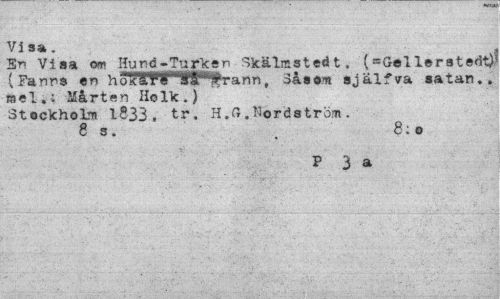 //// Visa. //// En Visa om Kurd -Turken Skälms t ed t. (=Gel leratftdt) (Fanns en hoScSW^Äft^l^rann, S&som själfva satan,, »el.: Mårten Holk.) Stockholm 1833, tr. H.G.Nordström . //// 8 s. _ 8:0 //// P 3 a ////