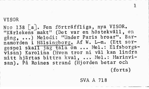 //// 1 //// VISOR //// N:o 138 [a]. Fem förträffliga, nya VISOR. "Kärlekens makt" (Det var en höstekväll, en gång, ...) Melodi: "Under Paris broar". Barnamorden i Hälsingborg. Af W. L-m. (Ett sorgespel skall jag tala om ... Mel.: Elfsborgs-visån) Karolina (Hvem tror ni väl kan lindra mitt hjärtas bittra kval, ... Mel.: Marinvisan). På Roines strand (Hjorden betar och //// (forts) //// SVA A 718 ////