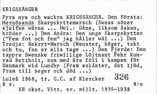 //// KRIGSSÅNGER //// Fyra nya och wackra KRIGSSÅNGER. Den Första: Hernösands Skarpskyttemarsch (Sweas söner sjelfwe wärna ... Mel.: Dåne, liksom åskan, bröder ...) Den Andra: Den unge Skarpskytten ("Fem fot och fem" jag håller wäl ...) Den Tredje: Rekryt=Marsch (Wenster, höger, takt och tu, fan er alla tage ...) Den Fjerde: Den tappre Swenske friwillige Löjtnant Pehr Konrad Betzholz, som med ära föll i kampen för Danmark wid Lundby (Fram soldater, det ljöd, Fram till seger och död ...) //// Luleå 1868, tr. G.C. af Klercker 326 8 s . 8: o //// KB okat. Vitt. sv. milit. 1835-1938 ////