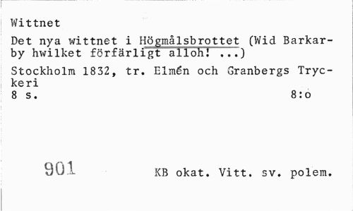 //// Wittnet //// Det nya wittnet i Högmålsbrottet (Wid Barkar-by hwilket förfärligt allohj "777) //// Stockholm 1832, tr. Elmén och Granbergs Tryckeri //// 8 s. 8:o //// 901 KB okat. Vitt. sv, polem. ////