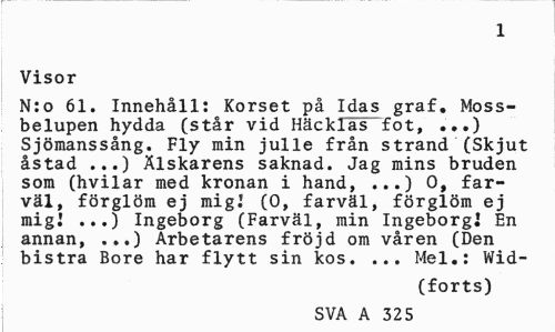 //// 1 //// Visor //// N:o 61. Innehåll: Korset på Idas graf. Mossbelupen hydda (står vid Häcklas fot, ...) Sjömanssång. Fly min julle från strand (Skjut åstad ...) Älskarens saknad. Jag mins bruden som (hvilar med kronan i hand, ...) 0, farväl, förglöm ej mig! (O, farväl, förglöm ej mig! ...) Ingeborg (Farväl, min Ingeborg] En annan, ...) Arbetarens fröjd om våren (Den bistra Bore har flytt sin kos. ... Mel.: Wid- //// (forts) //// SVA A 325 ////