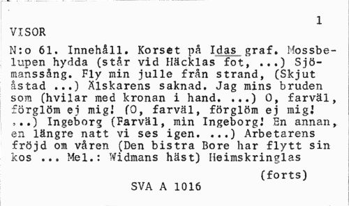 //// 1 //// VISOR //// N:o 61. Innehåll. Korset på Idas gra£. Mossbelupen hydda (står vid Häcklas fot, ...) Sjömanssång. Fly min julle från strand, (Skjut åstad ...) Älskarens saknad. Jag mins bruden som (hvilar med kronan i hand. ...) 0, farväl, förglöm ej mig.' fO, farväl, förglöm ej migj ,..) Ingeborg (Farväl, min IngeborgJ 5n annan, en längre natt vi ses igen. ...) Arbetarens fröjd om våren (Den bistra Bore har flytt sin kos ... Mel.: Widmans häst) Heimskringlas //// (forts) //// SVA A 1016 ////