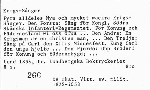 //// Krigs=Sånger //// Fyra alldeles Nya och mycket wackra Krigs= Sånger. Den Första: Sång för Kongl. Södra Skånska Infanteri=Regementet. För Konung och Fädernesland wi oss öfwa .. Den Andra: En Krigsman är en Christen man, ... Den Tredje: Sång på Carl den XII:s Minnesfest. Kung Carl den unga hjelte ... Den Fjerde: Upp Bröder! för Konung och fädernebygd; ... //// Lund 18 35, tr. Lundbergska Boktryckeriet 8 s. 8:0 //// 26B //// KB okat. Vitt. sv. milit. //// 1835-1938 ////