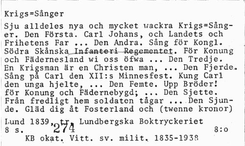 //// Krigs=Sånger //// Sju alldeles nya och mycket uackra Krigs=Sång-er. Den Första. Carl Johans, och Landets och Frihetens Far ... Den Andra. Sång för Kongl. Södra Skånska Infanteri Regementet. För Konung och Fädernesland wi oss öfwa ... Den Tredje. En Krigsman är en Christen man, ... Den Fjerde. Sång på Carl den XII:s Minnesfest. Kung Carl den unga hjelte, ... Den Femte. Upp Bröder! för Konung och Fädernebygd; ... Den Sjette. Från fredligt hem soldaten tågar ... Den Sjunde. Gläd dig åt Fosterland och (twenne kronor) //// Lund 1839,„tJ"Ä Lundbergska Boktryckeriet //// 8 s. 274 8:0 //// KB okat. Vitt. sv. milit. 1835-1938 ////
