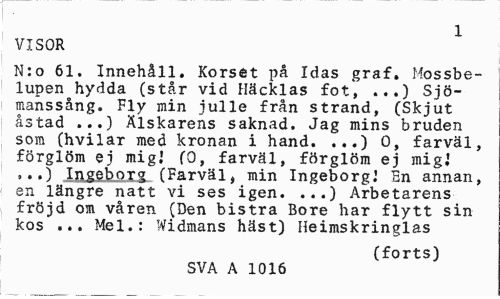 //// 1 //// VISOR //// N:o 61. Innehåll. Korset på Idas graf. Mossbelupen hydda (står vid Häcklas fot, ...) Sjömanssång. Fly min julle från strand, (Skjut åstad ...) Älskarens saknad. Jag mins bruden som (hvilar med kronan i hand. ...) 0, farväl, förglöm ej mig.' (0, farväl, förglöm ej mig] '••) IflgeboTg (Farväl, min Ingeborg] En annan, en längre natt vi ses igen. ...) Arbetarens fröjd om våren (Den bistra Bore har flytt sin kos ... Mel.: Widmans häst) Heimskringlas //// (forts) //// SVA A 1016 ////