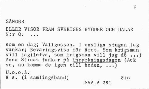 //// 2 //// SÅNGER //// ELLER VISOR FRÄN SVERIGES BYGDER OCH DALAR N: r 0. //// som en dag; Vallgossen. I ensliga stugan jag vankar; Beväringsvisa för året. Som krigsman vill jag(lefva, som krigsman vill jag dö ...) Anna Stinas tankar på inryckningsdagen (Ack se, nu komma de igen till heden, ..„) //// U. o. o. å. //// 8 s. (i samlingsband) 8:o //// SVA A 281 ////