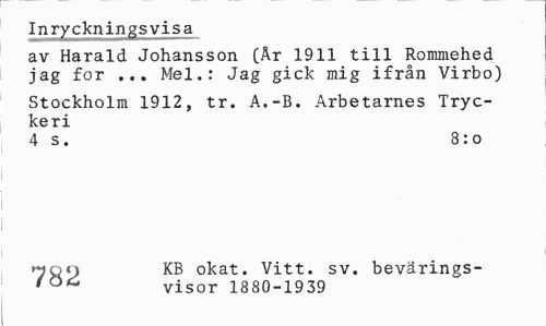 //// Inryckningsvisa //// av Harald Johansson (År 1911 till Rommehed jag for ... Mel.: Jag gick mig ifrån Virbo) //// Stockholm 1912, tr. A.-B. Arbetarnes Tryckeri //// 4 s. 8:o //// non KB okat. Vitt. sv. bevärings- //// 'ö^ visor 1880-1939 ////
