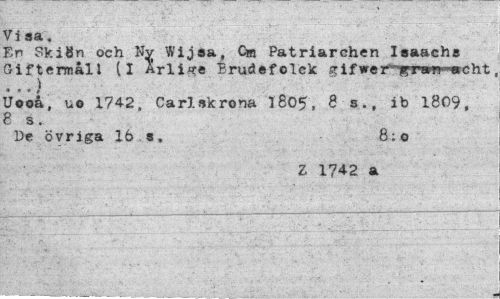 //// Visa. //// En Skitin och Ny Wijsa, Chj Patriarchen Isaachs Giftermål! (I Ärlige Brudefolck sr i f we r r mwv, c h t, //// Uooå, uo 1742, Carlskrona 1805, 8 s., ib 1809, 8 s. //// De övriga 16 s. 8;o //// Z 1742 a ////