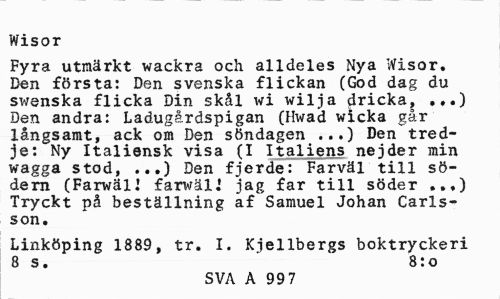 //// Visor //// Fyra utmärkt wackra och alldeles Nya Wisor. Den första: Den svenska flickan (God dag du swenska flicka Din skål wi wilja dricka, Den andra: Ladugårdspigan (Hwad wicka går långsamt, ack om Den söndagen ...) Den tredje: Ny Italiensk visa (I Italiens nejder min wagga stod, ...) Den fjerde: Farväl till södern (FarwälJ farwälJ jag far till söder ,.?) Tryckt på beställning af Samuel Johan Carlsson. //// Linköping 1889, tr. I. Kjellbergs boktryckeri 8 s. 8:0 //// SVA A 99 7 ////