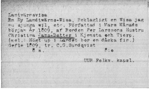 //// Lantvärravi sa //// En Ily Landtw&rna-Wisa, Beklagligt en Wisa jag nu sjunga wil, etn, Författad i Mars Månads början År 18C'9„ af Bonden Per Larssons Hustru Christina eTlSta ?rh Tlor^r //// (rr,e 1» ' högt up 1 J-iSinaet bor en daeka fir j Gefle 1*09, tr. C.G.Sundqvist //// 8a. P-.o //// UUB Folk v,, kapsl. ////