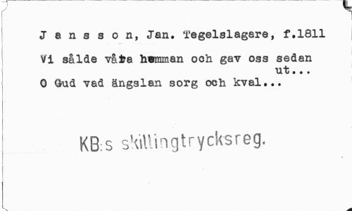 //// Jansson, Jan. Tegelslagare, f.1811 //// Vi sålde våta hemman och gav oss sedan //// ut... //// 0 Gud vad ängslan sorg och kval... //// i KB s sk\Ui n g t r y eks reg. //// - //// - ////