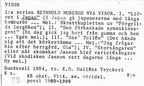 //// VISOR //// l:a serien REINHOLD MOBERGS NYA VISOR. I. "Lif-vet i Japan" (I Japan gå japaneserna med långa bamburör ... Mel.: Skrattkupletten ur "Förgyllda lergöken"); II. "Den förbaskade symaskinsagent" (En dag gick jag bort från gumma och hem ... Egen mel.); III. "Ase" Tollén" (Det hände sig att det körkestämma ... Mel.:"Jag frågar hin efter herrgård, Ola"); IV. "Storsångaren" ' eller när skomakar Janson blef varietésangare (Vid skodisken Janson satt dagarne långa ... Ny mel.) //// Sundsvall 1904, tr. K.D. Halléns Tryckeri //// 8 S* KB okat. Vitt. sv. världsl. 8:0 //// ; poesi 1900-1909 ////