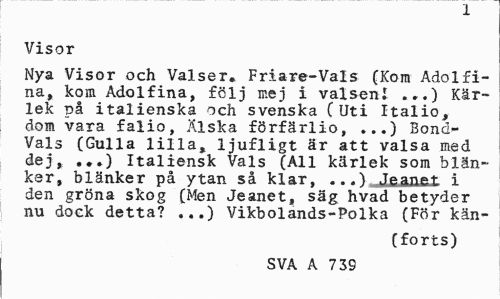 //// X //// Visor //// Nya Visor och Valser. Friare-Vals (Kora Adolfina, kora Adolfina, följ mej i valsen! ...) Kärlek på italienska och svenska (Uti Italio, dom vara falio, Älska förfärlio, ...) Bond-Vals (Gulla lilla, ljufligt är att valsa med dej, ...) Italiensk Vals (All kärlek som blänker, blänker på ytan så klar, ...) Jeanet i den gröna skog (Men Jeanet, säg hvad betyder nu dock detta? ...) Vikbolands-Polka (För kän- //// (forts) //// SVA A 73S ////