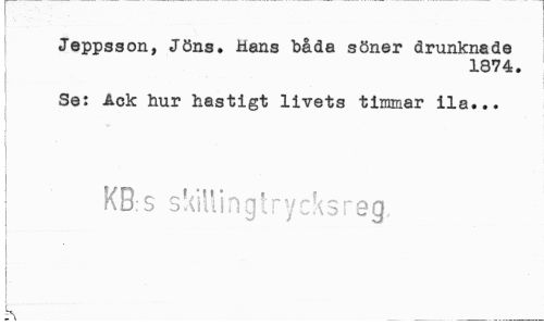 //// Jeppsson, Jöns. Mans båda söner drunknade //// 1874. //// Se: Ack hur hastigt livets timmar ila... //// KB-s skillingtrycksreg, k ... ////