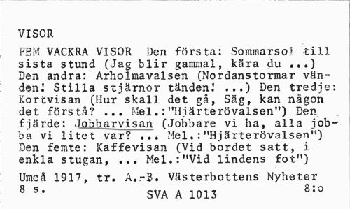 //// VISOR //// FEM VACKRA VISOR Den första: Sommarsol till sista stund (Jag blir gammal, kära du ...) Den andra: Arholmavalsen (Nordanstormar vän-den! Stilla stjärnor tänden.' ...) Den tredje: Kortvisan (Hur skall det gå, Säg, kan någon det förstå? ... Mel.:"Hjärterövalsen") Den fjärde: Jobbarvisan (Jobbare vi ha, alla jobba vi litet var? ... Mel.:"Hjärterövalsen") Den femte: Kaffevisan (Vid bordet satt, i enkla stugan, ... Mel.:"Vid lindens fot") //// Umeå 1917, tr. A.-B. Västerbottens Nyheter //// 8 s* SVA A 1013 8:0 ////