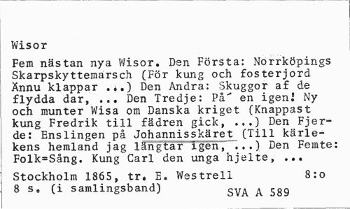 //// Wisor //// Fem nästan nya Wisor. Den Första: Norrköpings Skarpskyttemarsch (För kung och fosterjord Ännu klappar .«.) Den Andra: Skuggor af de flydda dar, ... Den Tredje: På" en igen! Ny och munter Wisa om Danska kriget (Knappast kung Fredrik till fädren gick, ...) Den Fjerde: Enslingen på Johannisskäret (Till kärlekens hemland jag längtar igen, .,.) Den Femte: Folk=Sång. Kung Carl den unga hjelte, ... //// Stockholm 1865, tr. E. Westrell 8:0 //// 8 s, (i samlingsband} SVA ^ sgg ////