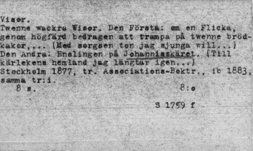 //// Jiaw. , //// rwenna waekra Wisar, Den Förata; m en ilicka, genom högfärd tedragan att trampa på twenne trod-tcakor,... (Med aargaen ton jag sjunga 11. ..) Den Andra: Enslingen på ^o^plU^t. (Till kärlekens hemland jag längtar igen...) Stockholm 1877, tr. Aaaaciationa-Boktr., it 1&83, samma tr;i. 0 //// 8 a, //// S 1759 f ////