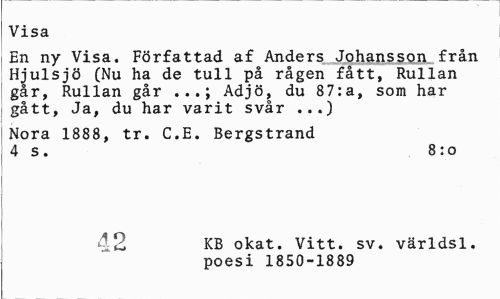 //// Visa //// En ny Visa. Författad af Anders Johansson från Hjulsjö (Nu ha de tull på rågen fått, Rullan går, Rullan går ...; Adjö, du 87:a, som har gått, Ja, du har varit svår ...) //// Nora 1888, tr. C.E. Bergstrand 4 s. 8:0 //// 42 KB okat. Vitt. sv. världsl. //// poesi 1850-1889 ////