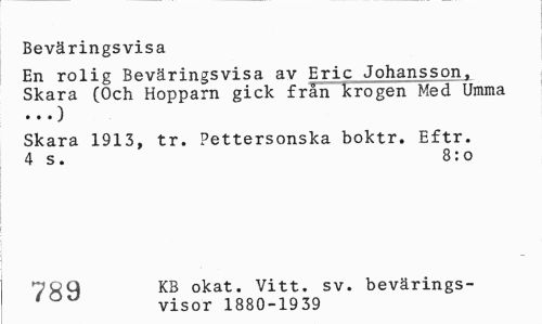 //// Beväringsvisa //// En rolig Beväringsvisa av Eric Johansson, Skara (Och Hopparn gick från krogen Med Umma //// Skara 1913, tr. Pettersonska boktr. Eftr. 4 s. 8:0 //// 7öQ KB okat. Vitt. sv. bevärings- //// visor 1880-1939 ////