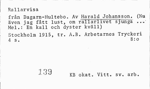 //// Rallarvisa //// från Dagarn-Hultebo. Av Harald Johansson. (Nu även jag fått lust, om rallarlivet sjunga Mel.: En kall och dyster kväll) //// Stockholm 1915, tr. A.B. Arbetarnes Tryckeri 4 s. 8:0 //// ; KB okat. Vitt. sv. arb. ////