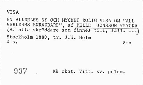 //// VISA //// EN ALLDELES NY OCH MYCKET ROLIG VISA OM "ALL VERLDENS SKRÄDDARE", af PELLE JONSSON KRYCKA (Af alla skräddare son finnes till, fall. . //// Stockholm 18 80, tr. J.W. Holm 4 s. 8: o //// 937 okat. Vitt. sv. polem. ////