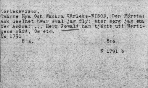 //// kärleksvisor. //// Twänre %a Och Wackra Kärlek ••WISOR, Den Företa; Ack uselhet hwar skal Jag f*ly: stor sorg jag etc» Den Andra; Herr Jewald han tjänte uti Herti- //// gens scård , Om etc. ' "¦" 1 1" Uo 1791 //// N 17VI h ////