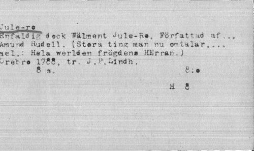 //// 'ule-re //// enfald i é ®ck Wälment Jule-R«, Författad af .. unund Hudell, (Störa ting man nu omtalar,.,» ie 1.: Hela werlöen frögden» HErrar , ) -rer-r« i??8, tr. J.^.-indh, //// 8 a, 8:. //// H 5 ////
