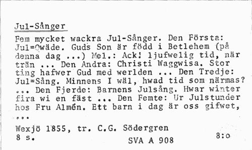//// Jul-Sånger //// Fem mycket wackra Jul-Sånger. Den Första: Jul=Owäde. Guds Son är född i Betlehem (på denna dag Mel,: Ack.' ljufwelig tid, när //// trän ... Den Andra: Christi Waggwisa. Stor ting hafwer Gud med werlden ... Den Tredje: Jul=Sång. Minnens I wäl, hwad tid som närmas? •«. Den Fjerde: Barnens Julsång. Hwar winter fira wi en fäst ... Den Femte: Ur Julstunder hos Fru Almén, Ett barn i dag är oss gifwet, //// o » • //// Wexjö 1855, tr. C.G. Södergren 8 s* SVA A 908 8:0 ////