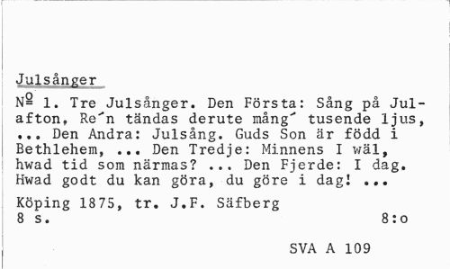 //// Julsånger //// N§ 1. Tre Julsånger. Den Första: Sång på Julafton, Re"n tändas derute mång' tusende ljus, ... Den Andra: Julsång. Guds Son är född i Bethlehem, ... Den Tredje: Minnens I wäl, hwad tid som närmas? ... Den Fjerde: I dag. Hwad godt du kan göra, du göre i dagI ... //// Köping 1875, tr. J.F. Säfberg 8 s. 8:o //// SVA A 109 ////