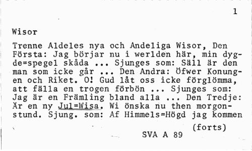 //// 1 //// Wisor //// Trenne Aldeles nya och Andeliga Wisor, Den Första: Jag börjar nu i werlden här, min dyg-de=spegel skåda ... Sjunges som: Säll är den man som icke går ... Den Andra: öfwer Konungen och Riket. 01 Gud låt oss icke förglömma, att fälla en trogen förbön ... Sjunges som: Jag är en Främling bland alla ... Den Tredje: Är en ny Jul=Wisa. Wi önska nu then morgonstund. Sjung, som: Af Himmels=Högd jag kommen //// (forts) //// SVA A 89 ////