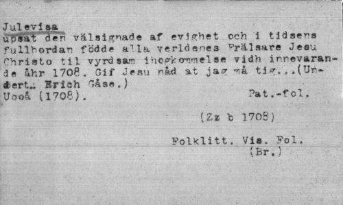 //// J ul evl sa //// uBsat 5en välsignade af evighet och i tid sena fullbordan fcdde a1 la verldenes ^rälsars Jesu ^hristo til vyrd san ihcgkomnelse vidh innevarande åhr 1708. Gif Jesu nåd at jag må tig.,.(Ur-éertu Eriah Gåse.) //// Uooå (1708). Pat.-fol. //// [Zz b 1708} //// Folklitt. Vis. Fol. //// (Br.) ////