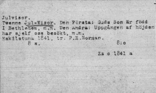 //// Julvisor, //// Twenne Jul-Wi.3or. Den Fcrstai Guds Son är född I Beth lebeman'™'. .Den *ndra; Uppgången af höjden har sjelf oss besökt, m.it. Eskilstuna 1841, tr. ?.E .-Norman . //// 8 s. 8;o //// Zz c 1841 a ////