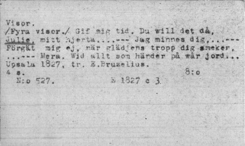 //// Visor, //// /Pyra visor./ 3if "mig 114. Du' vill >1 et då, tjul<p; »itt hj er.ta.. ..— Jag minnes dljgy. . .---PörgS,t mig ej, när Glädjens tropp dig g.mektr, //// Mera. Wjd allt som händer på wår 4ord.». Upsala 13*7 , tr. B.Bru&eliu». 4 ». 3: c //// E: o ~27. & 1827 c 3. ////